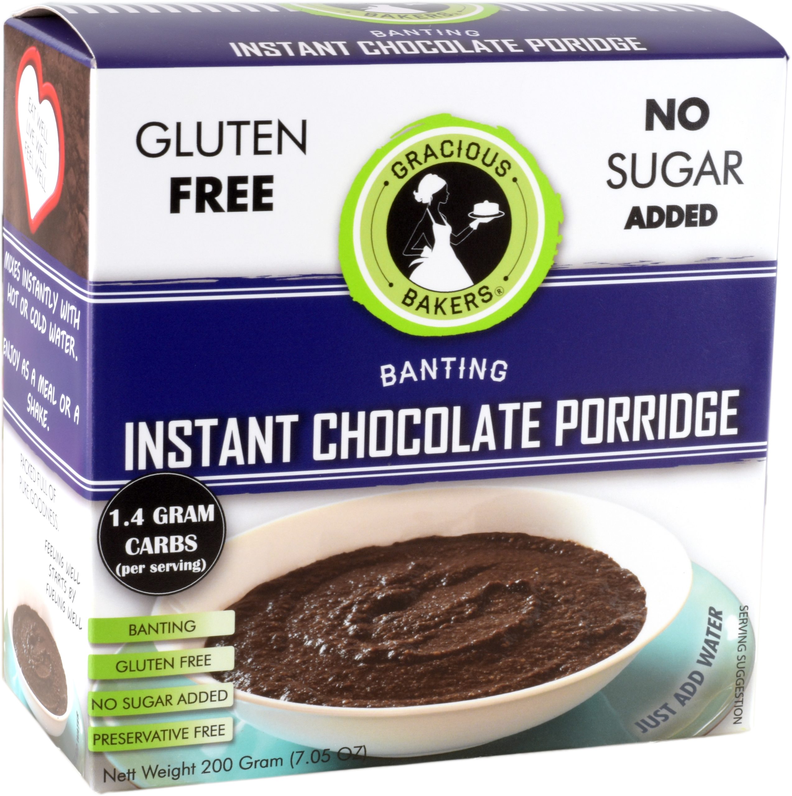 Gracious Bakers porridges are not only quick and convenient, but also wholesome. It is made with nut and seed flours packed full of rich nutrients. Just add hot or cold water stir and enjoy. It is not only delicious, but also low in carbs, gluten free and sugar free. Each portion of 40 grams contains only 1.4 Gram Carbs and packaged in portion packs ideal for on the go.